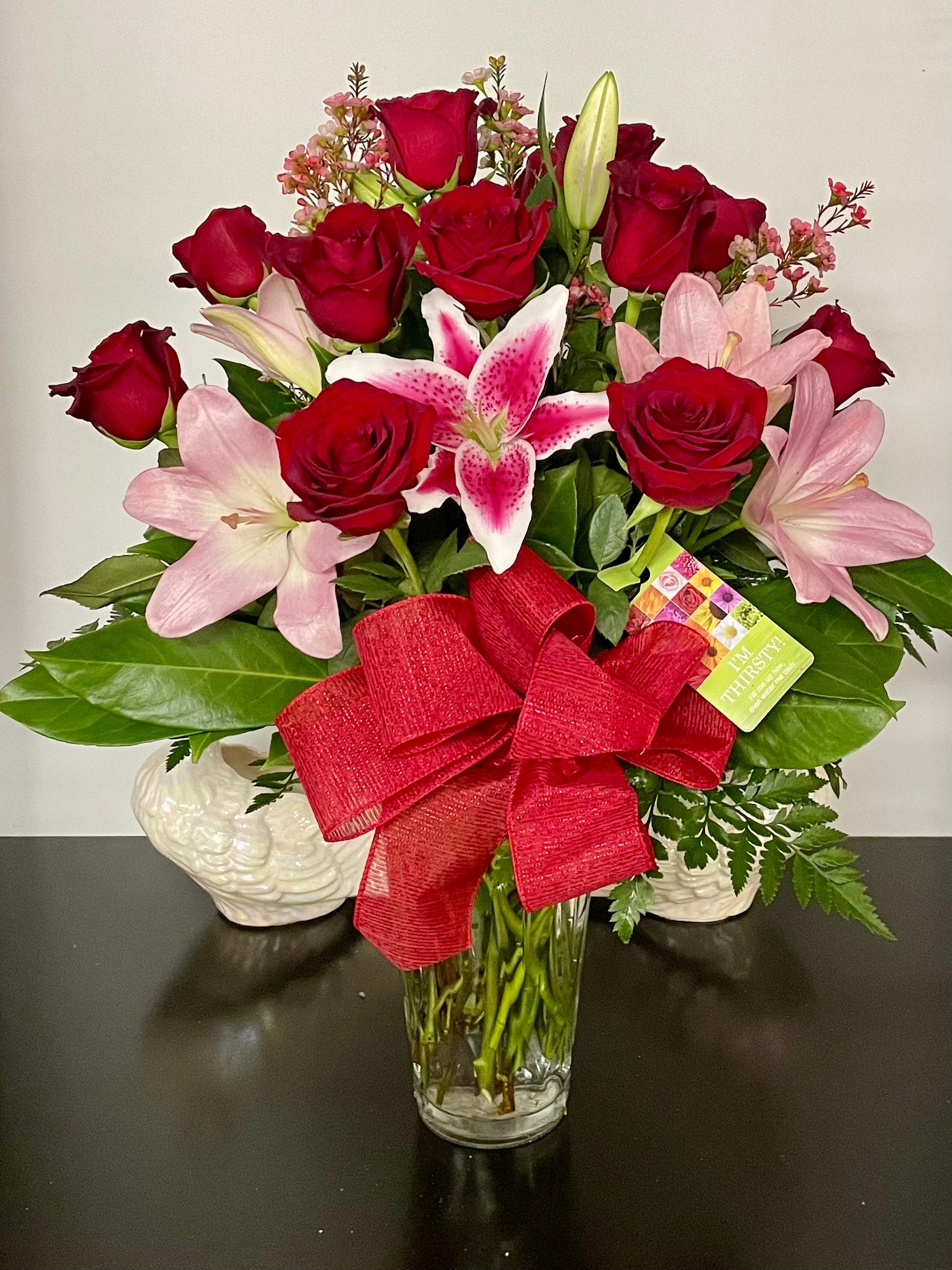 Dozen Beautiful Red Roses with Lilies arrangement in a vase for that special person in your life.