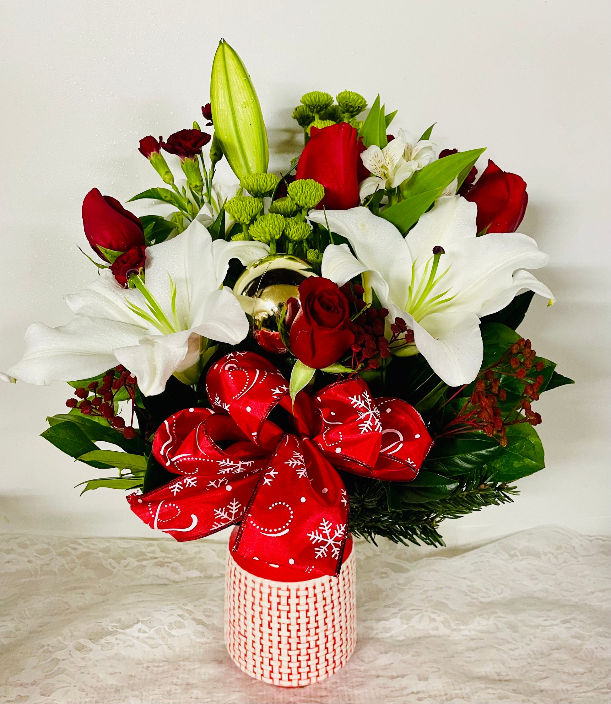 A beautiful Christmas bouquet mixed with red, green and white flowers.